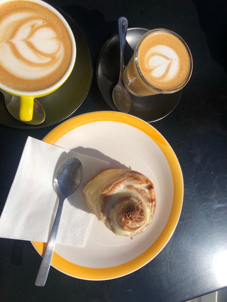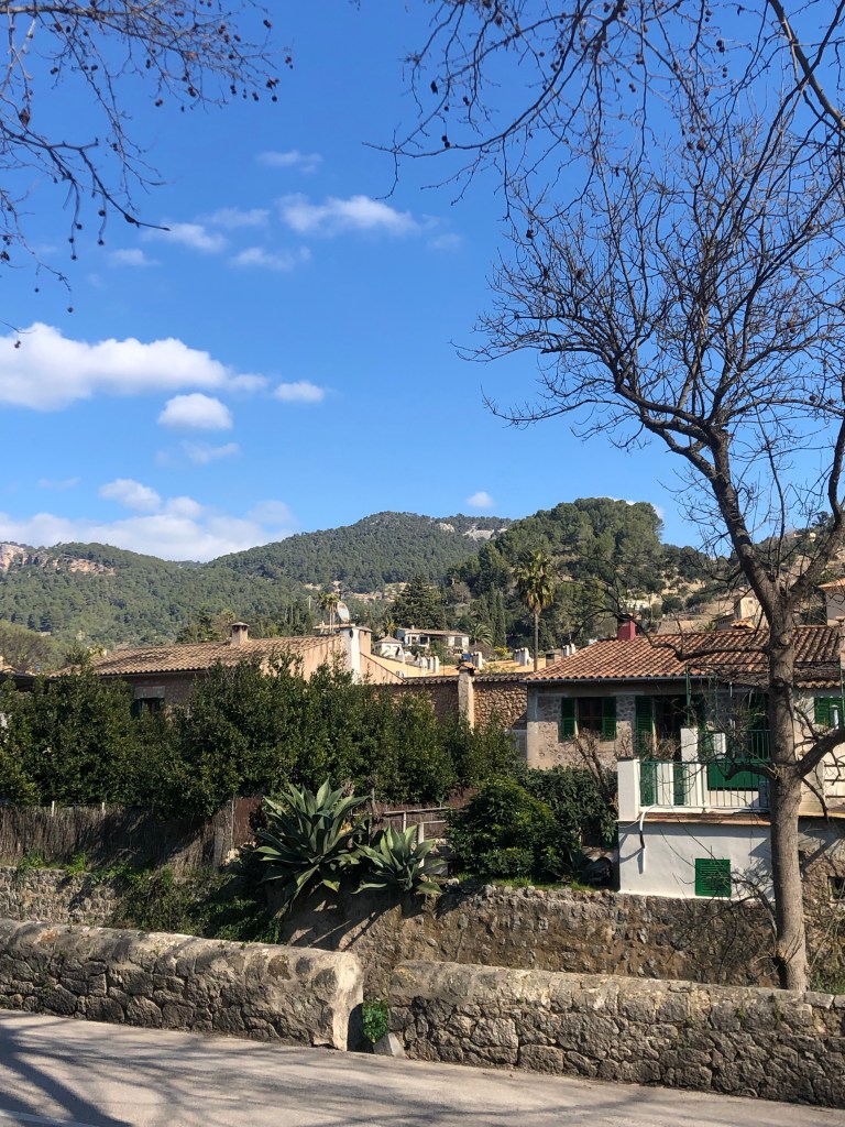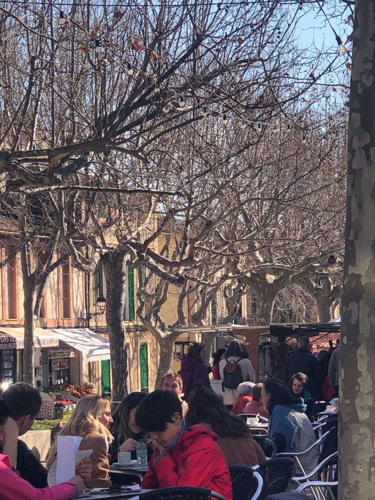 Det blev en promenad i byn, köpa blommor och grönsaker på vår söta marknad och sedan en kaffe i solen. Träffade folk vi känner och det blev småpratande här och där. Den där sköna gemenskapen jag skrev om i förra inlägget blir ännu tydligare när solen skiner och alla umgås ute medan solen värmer vilket inte är så många timmar så här års innan solen försvinner bakom bergen.