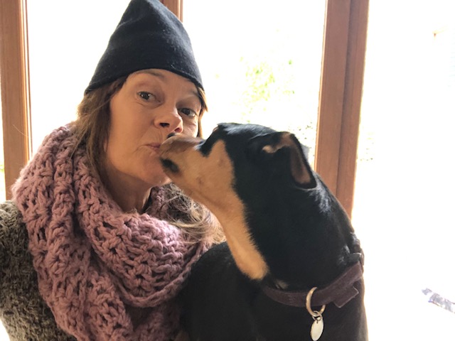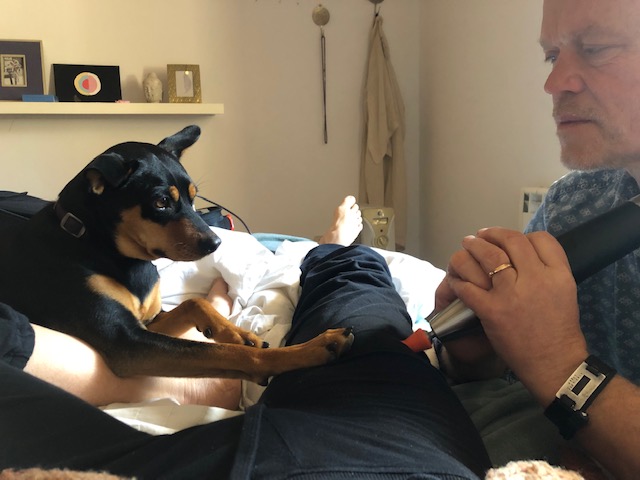 Nedan på bilden ser ni vår hund Budi som hjälper till med behandlingen. Sötnosen!