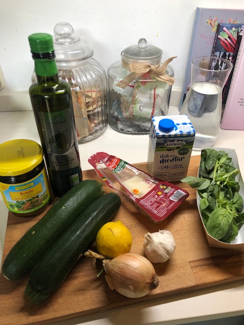 – 1 hackad gul lök, 1 hackad vitlök, 2 hackade zucchinis, fräs i smör eller olja.