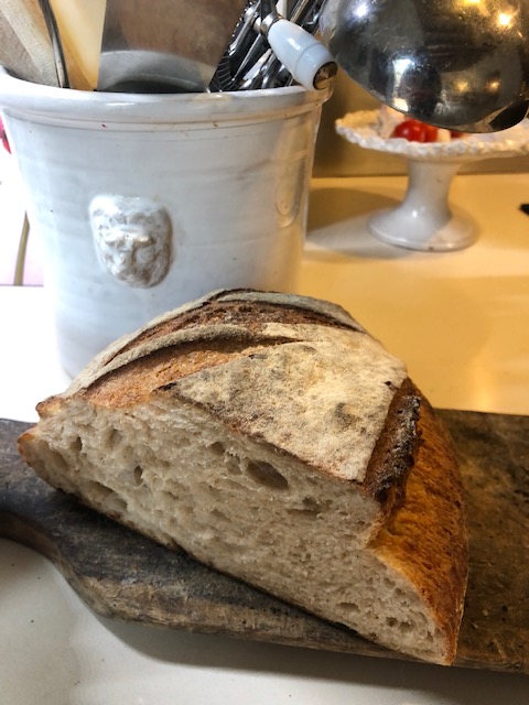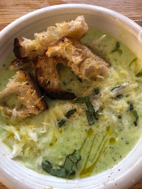 En jättegod zucchinisoppa som vi toppade med surdegskrutonger, basilika, riven parmesan och riven citronzest från citronerna i trädgården.