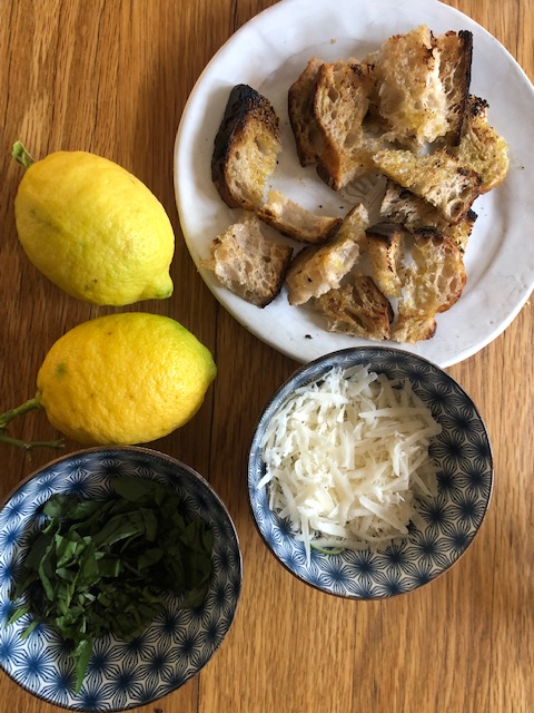 Servera med hackad basilika, riven parmesan och stekta brödkrutonger och ja! citronzesten, den lyfter verkligen soppan och så ringla gärna en god olivolja på.